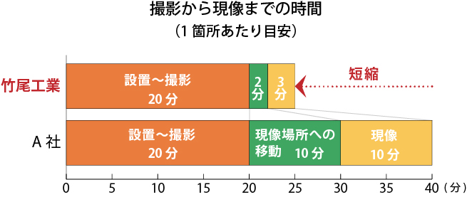例えば、現場でフィルムが現像出来るまでに1枚あたり約10分+現像⾞までの移動時間がかかっていました。